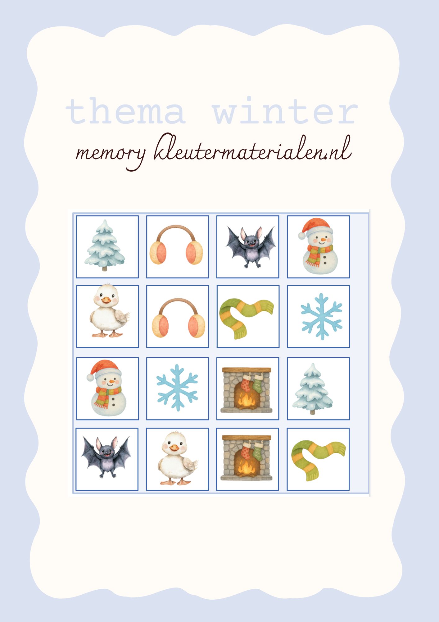 memory – thema winter Dit delen: Klik om te delen op Facebook (Opent in een nieuw venster) Facebook Klik om op Pinterest te delen (Opent in een nieuw venster) Pinterest DownloadOok interesse in de themabundel rondom winter? themabundel winterVanaf €5.99Opties selecteren spelletjesbundel – spelinloop winterVanaf €5.99Opties selecteren Themabundel winterVanaf €5.99Opties selecteren hoekenwerk kleuters Rekenen spelend leren thema winter Thematisch werken